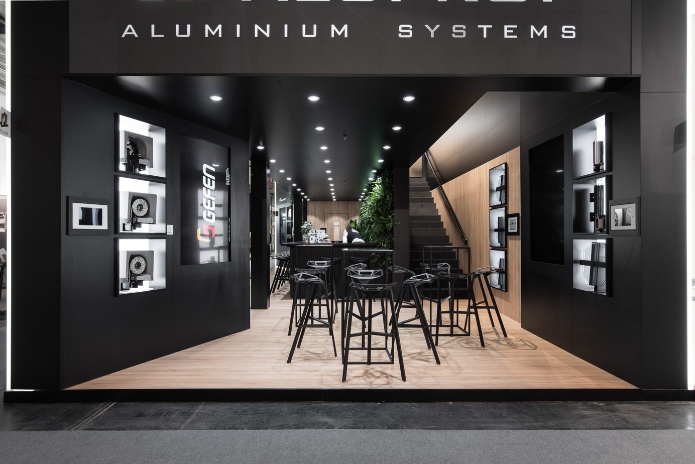 Dla nas, jako studia projektującego i budującego stoiska targowe, ważne jest kreowanie wyrazistej atmosfery, aby wszystkie elementy były ze sobą spójne i jednocześnie wykonane solidnie, w oparciu o materiały wysokiej jakości. Dlatego stawiamy na nowoczesne, modne materiały, które razem z ideą budują wspólną jakość. Przekonaliśmy klienta do stoiska wykonanego z płyt laminowanych, począwszy od ścian, sufitów, a skończywszy na meblach i detalach. – Aby upewnić klienta co do słuszności tego pomysłu, wyprodukowaliśmy próbną ścianę, której jakość spotkała się z akceptem po stronie firmy Aluprof. Podziały, które pojawiają się w przypadku ścian laminowanych zostały tak zaprojektowane, aby kreowały interesujący detal, a nie przypadkowe działania – wspomina Dorota Czarska, project manager w Smart Design Expo.
