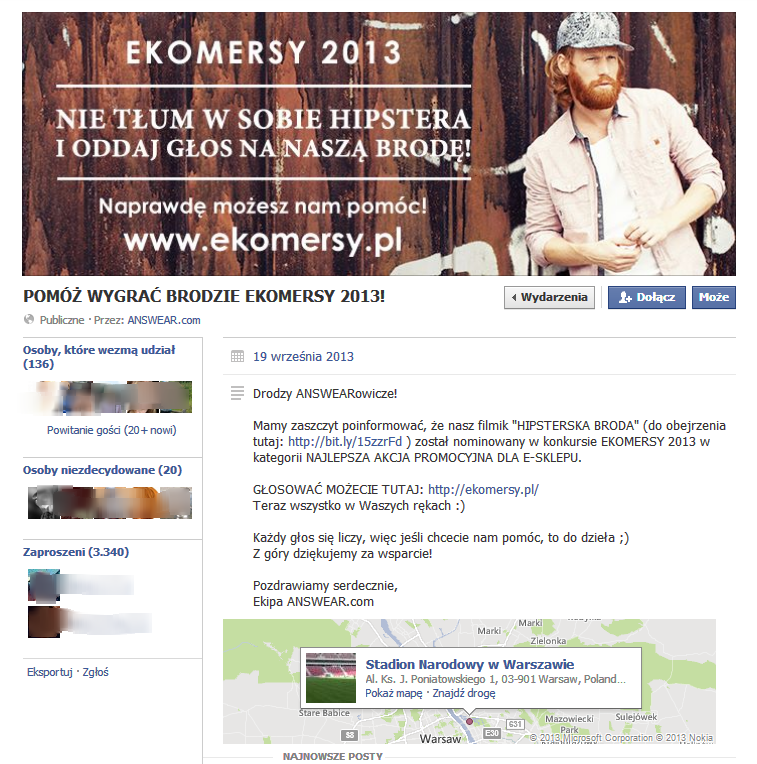 Potraktowaliśmy konkurs „Ekomersy 2013” jako dobrą zabawę (tak samo zresztą jak samą akcję z hipsterską brodą) i nie podejmowaliśmy prawie żadnych działań agitacyjnych. Nie kupowaliśmy głosów, ba, nawet nie użyliśmy swojej kilkusettysięcznej bazy newsletterowej. Kampanię prowadziliśmy jedynie na facebooku, w dodatku na stosunkowo niewielką skale. Poprosiliśmy 2 razy naszych fanów o głosy w formie postów oraz założyliśmy wydarzenie pod nazwą „Pomóż brodzie wygrać Ekomersy 2013”.