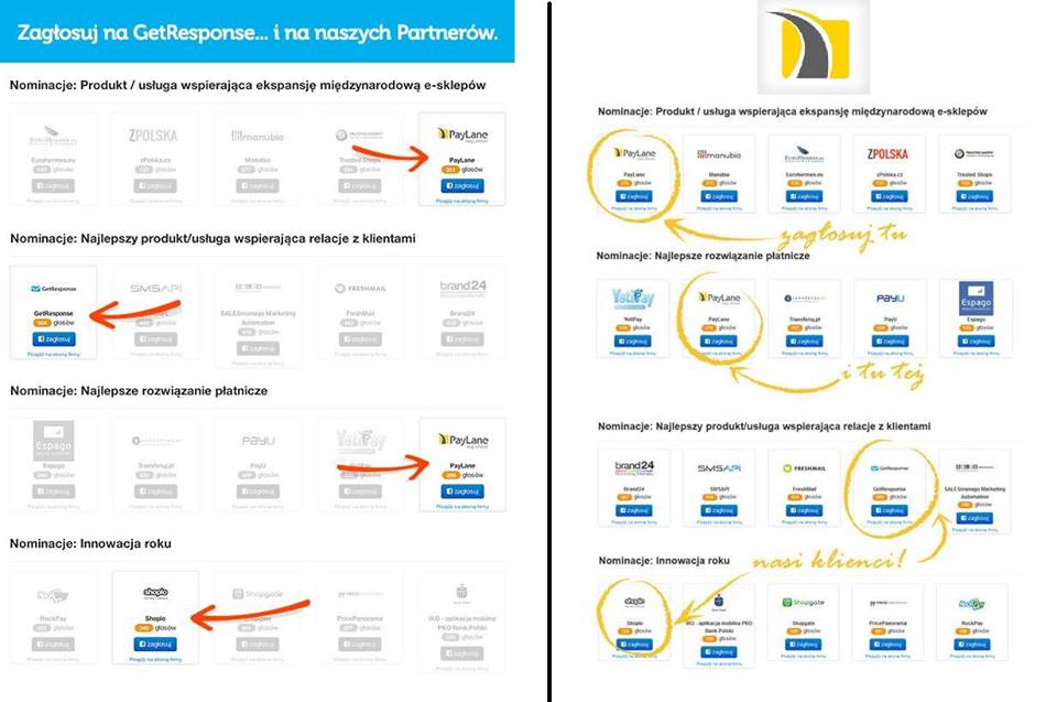 Na najwięcej pozwoliliśmy sobie oczywiście na Facebooku i tu reakcja była od razu zauważalna (like, share’y, nowi fani strony oraz wzrost liczby głosów). Głosowały na nas osoby, którym spodobał się nas sposób komunikacji i zachęcania do głosowania (oraz zapewne dystans do siebie). Jednak bardzo dużo dał nam także kontakt z klientami i partnerami za pośrednictwem maili czy newsletterów. Tutaj komunikacja była bardziej stonowana, a głosy były wyrazem docenienia naszej rzeczywistej długofalowej współpracy, obsługi klienta czy funkcjonowania naszego rozwiązania płatniczego. Nie musieliśmy rozśmieszać, by zachęcić do oddania głosów.