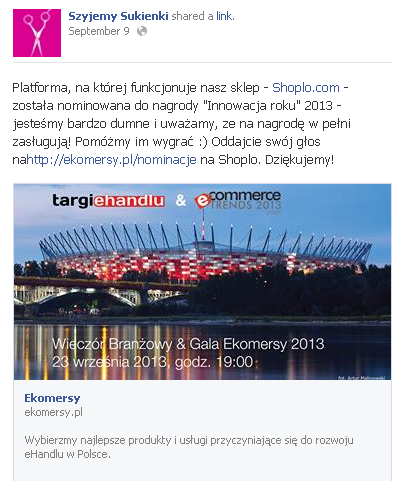 Ogólnie rzecz biorąc, byliśmy bardzo zadowoleni z zaangażowania zarówno naszych fanów jak i klientów w walkę o Ekomersa. Wielu z nich poczuło, że to także Oni są częścią konkursu, więc chętnie udostępniali informacje o naszym uczestnictwie, dopytywali o wyniki i wspierali nas swoimi głosami.