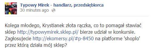 Do tematu Ekomersów podeszliśmy luźno, zupełnie nie spodziewając się wygranej. Zastosowaliśmy raczej standardowe formy agitacji i mamy nadzieję nie zbyt natarczywe. Pojawiły się dwa wpisy na naszym wallu, były też posty na profilach prywatnych i na fanpage’ach naszych partnerów. Dodatkowo wsparliśmy się mailingiem do bazy ok. 5000 rekordów wysłanym dwukrotnie, czego skutkiem było 110 dodatkowych głosów. Oczywiście pracownicy zaangażowali się w aktywizację znajomych, co przyniosło bardzo dobry efekt i za co jesteśmy wszystkim bardzo wdzięczni.