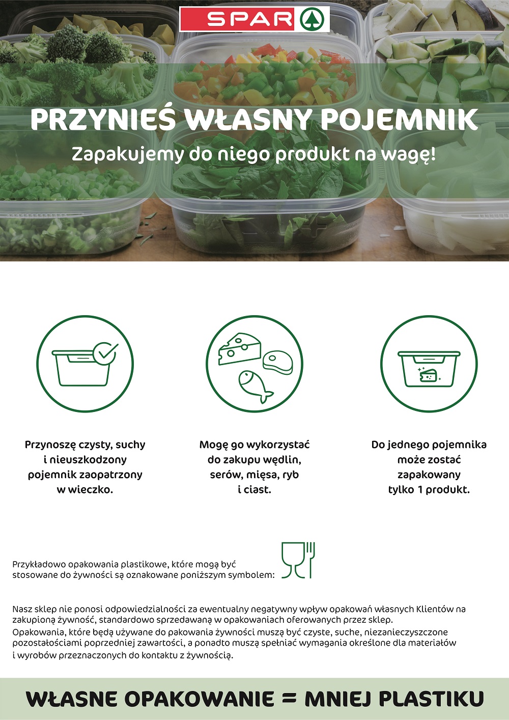 W ramach działań związanych z ograniczaniem ilości wykorzystywanego jednorazowego plastiku, sieć Spar umożliwia klientom przynoszenie własnych opakowań. Można je wykorzystać przy zakupie produktów na wagę (np. mięsa, wędlin, serów, ryb czy ciast).