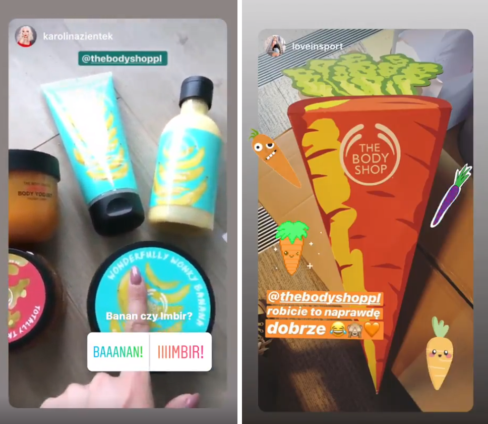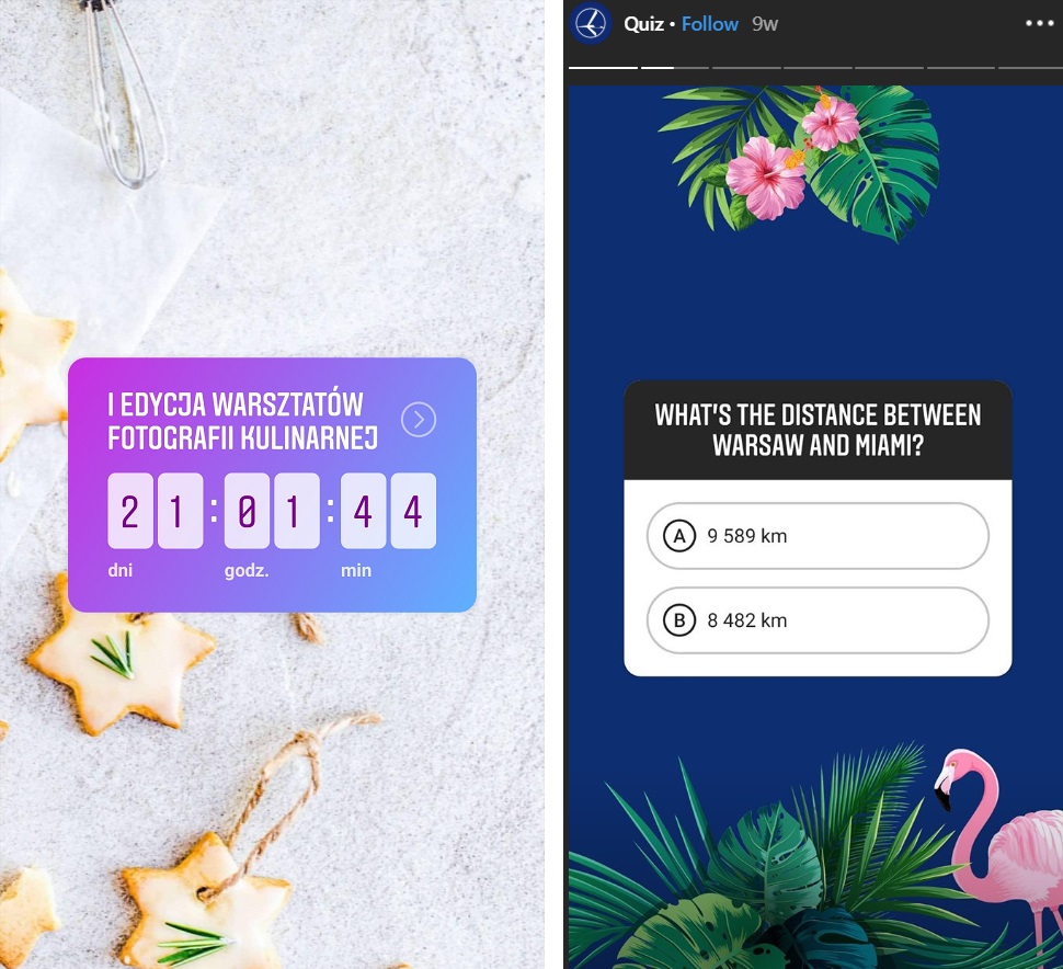 Ilustracje 6: Przykłady Instastory z wykorzystaniem narzędzi: ankieta, naklejki, odliczanie oraz quiz