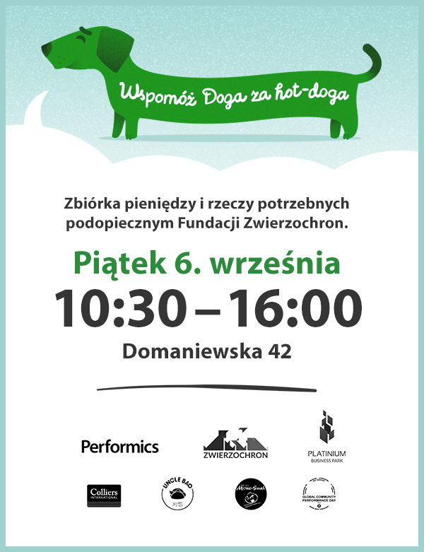 Performics, we współpracy z Fundacją Zwierzochron oraz zarządcą Platinium Business Park, organizują kolejną edycję wydarzenia charytatywnego „Wspomóż doga za hot-doga”, które na stałe wpisało się w krajobraz warszawskiego „Mordoru”. W piątek 6. września br. na terenie Platinium Business Park, od godziny 10.30 do 16.30, w zamian za datki pieniężne lub rzeczy potrzebne Fundacji do opieki nad zwierzętami (karmę bytową suchą i mokrą dla psów i kotów, zakraplacze na kleszcze i podkłady higieniczne dla szczeniąt do nauki czystości oraz długie i mocne smycze taśmowe), organizatorzy akcji będą rozdawać kupony, które można wymienić na dania serwowane przez foodtrucki biorące udział w wydarzeniu (Momo Smak i Uncle Bao).