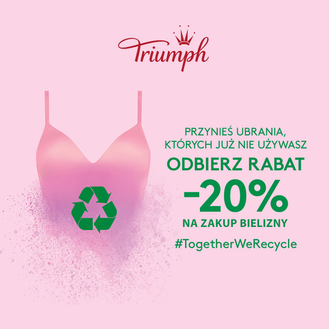 Marka Triumph i organizacja Texaid rozpoczęły współpracę pod hasłem „Together We Recycle – zadbajmy razem o naszą planetę”, podczas której od 28 sierpnia do 1 października 2019, w prawie 4000 punktach sprzedażny brand zbiera niechciane ubrania, ułatwiając klientom pozbywanie się ich w bardziej świadomy i zrównoważony sposób. W podziękowaniu za udział w akcji, klienci otrzymają voucher zniżkowy na zakup nowego produktu marki.