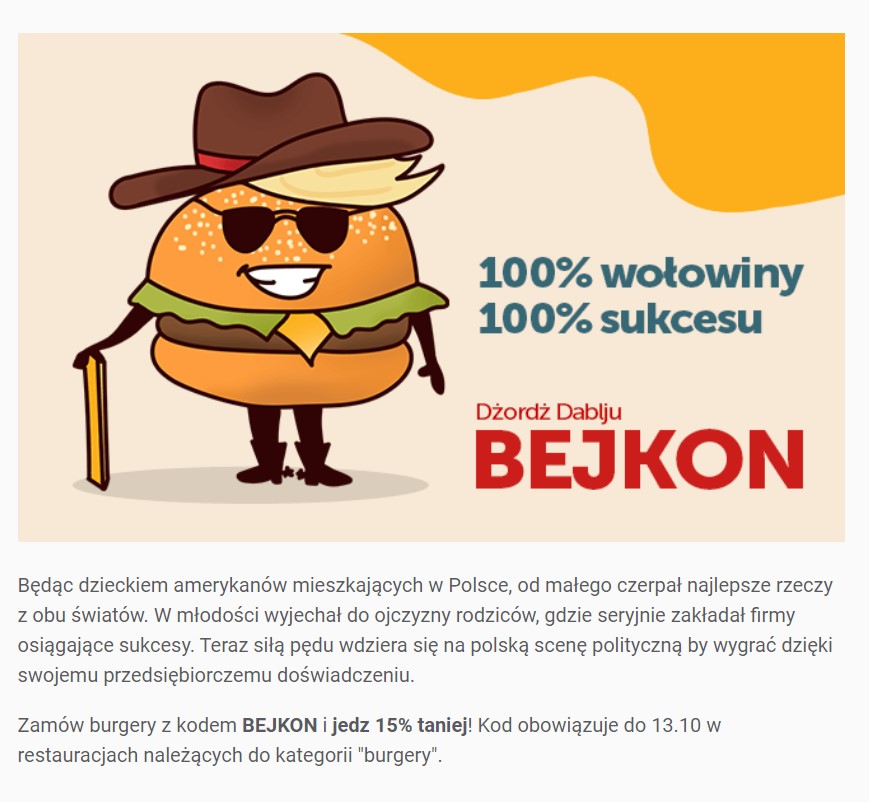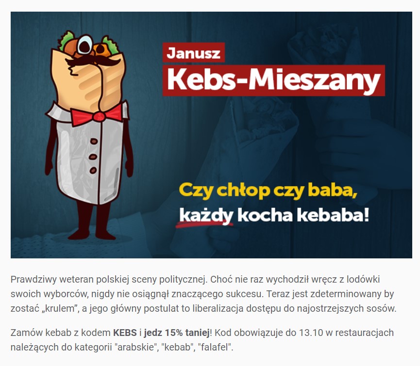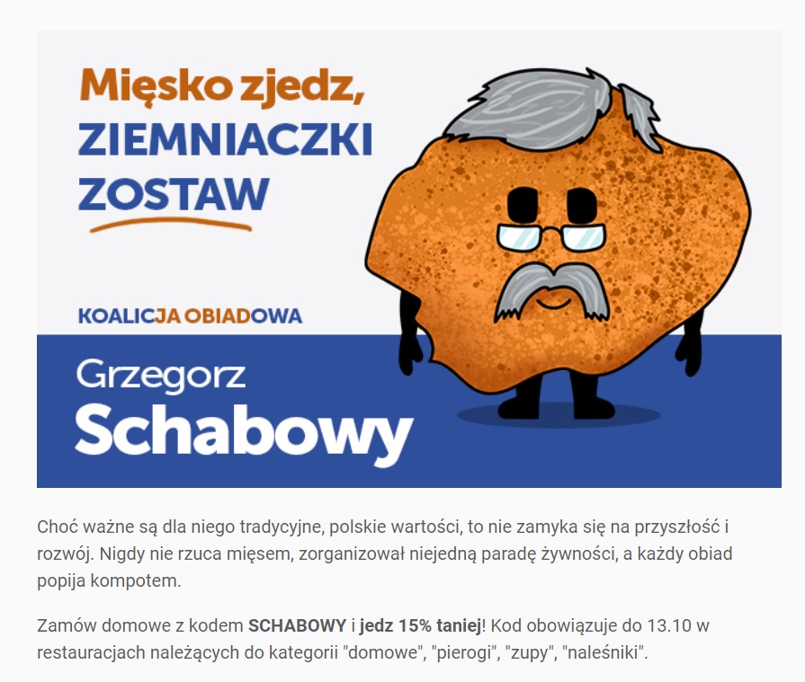 W ramach „Kampanii wybornej” platforma zaprezentowała serię grafik nawiązujących do typowych plakatów wyborczych partii politycznych. Mamy tutaj więc kandydatkę Małgorzatę Serową z partii Pizza i Sosy, Grzegorza Schabowego z Koalicji Obiadowej czy też „niezrzeszonych polityków” – np. Janusza Kebs-Mieszanego.