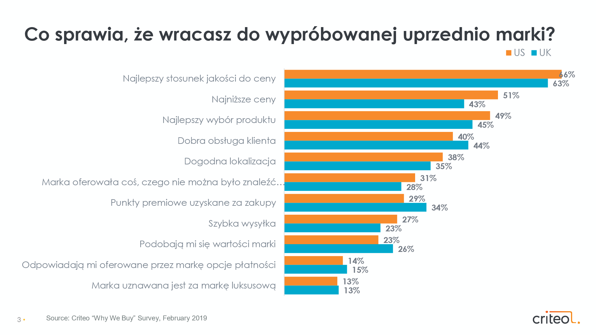 W badaniu „Dlaczego kupujemy dany produkt?”, zrealizowanym na zlecenie firmy Criteo, zapytaliśmy ponad 2 tysięcy konsumentów z Wielkiej Brytanii i USA, co sprawia, że wracają do marki oraz co powoduje, że szukają nowej.