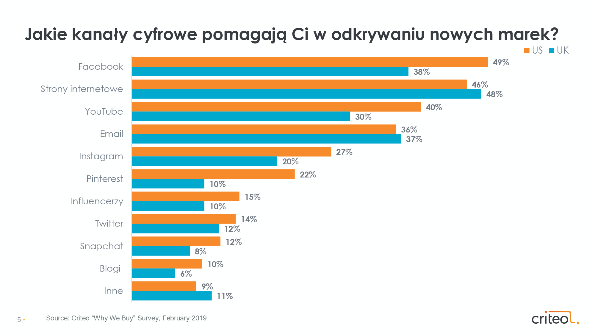 W przypadku kupujących z Wielkiej Brytanii witryny internetowe są najpopularniejszym kanałem odkrywania nowych marek. Natomiast jeśli chodzi o amerykańskich klientów – to Facebook zajął pierwsze miejsce.