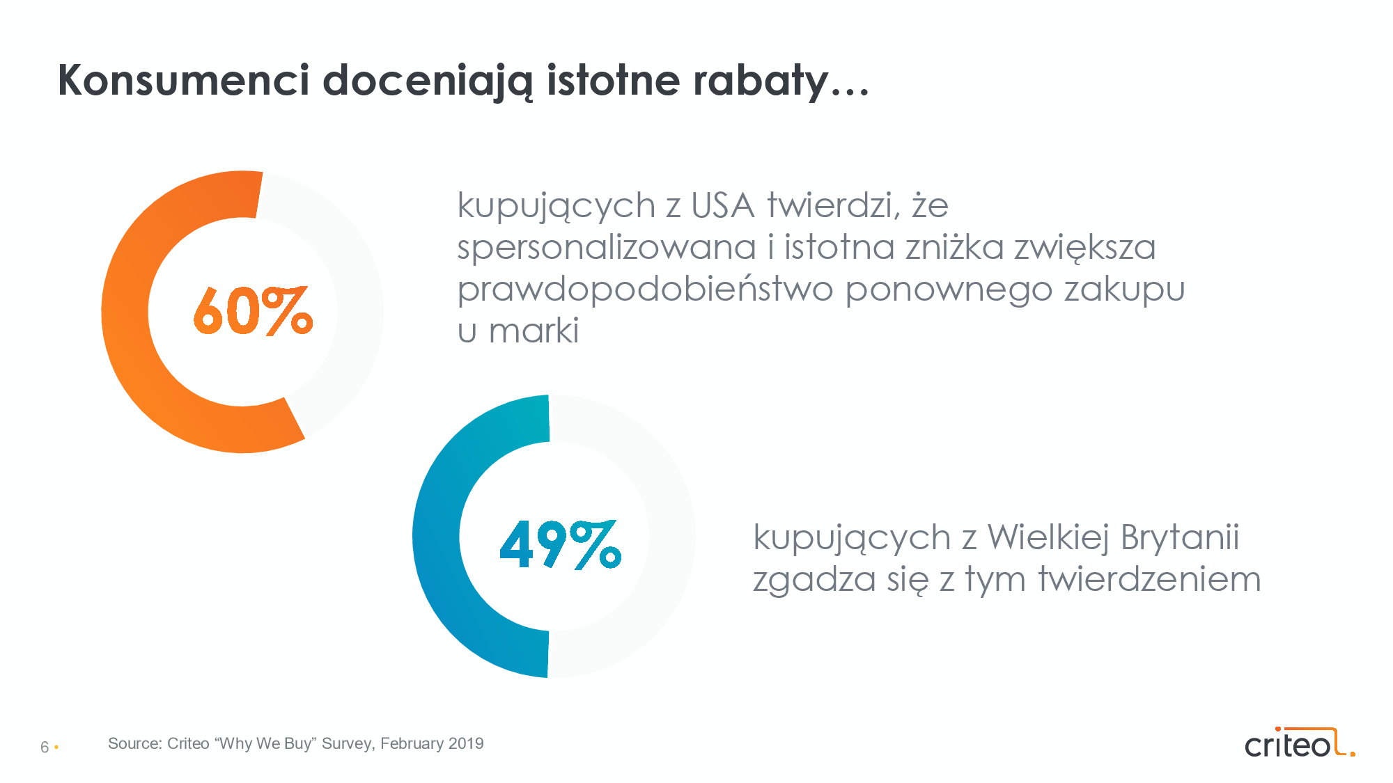 W naszym badaniu zapytaliśmy kupujących z Wielkiej Brytanii, jakie czynniki sprawiają, że po wypróbowaniu nowej marki, chcą ponownie zrobić zakupy u danej firmy. 49% wymieniło spersonalizowaną reklamę i istotną dla nich zniżkę. To samo tyczy się 60% kupujących z USA.