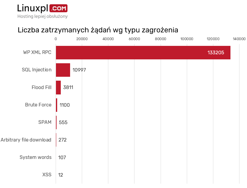 W badaniu najwięcej zarejestrowano prób dotarcia do pliku odpowiedzialnego za XML-RPC w systemie CMS WordPress. To mechanizm zdalnego wywoływania procedur, który – jeśli wykorzysta się go niewłaściwie – potrafi bardzo szybko i efektywnie „popsuć” stronę.