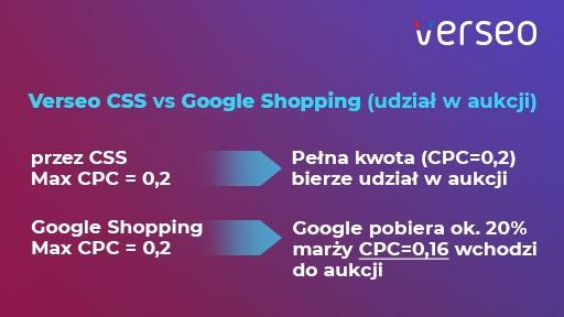 W przypadku dodania feedu produktowego do porównywarki Verseo CSS każde kliknięcie potencjalnego klienta w Twoją reklamę będzie tańsze o prowizję Google – czyli o 20% założonego budżetu.