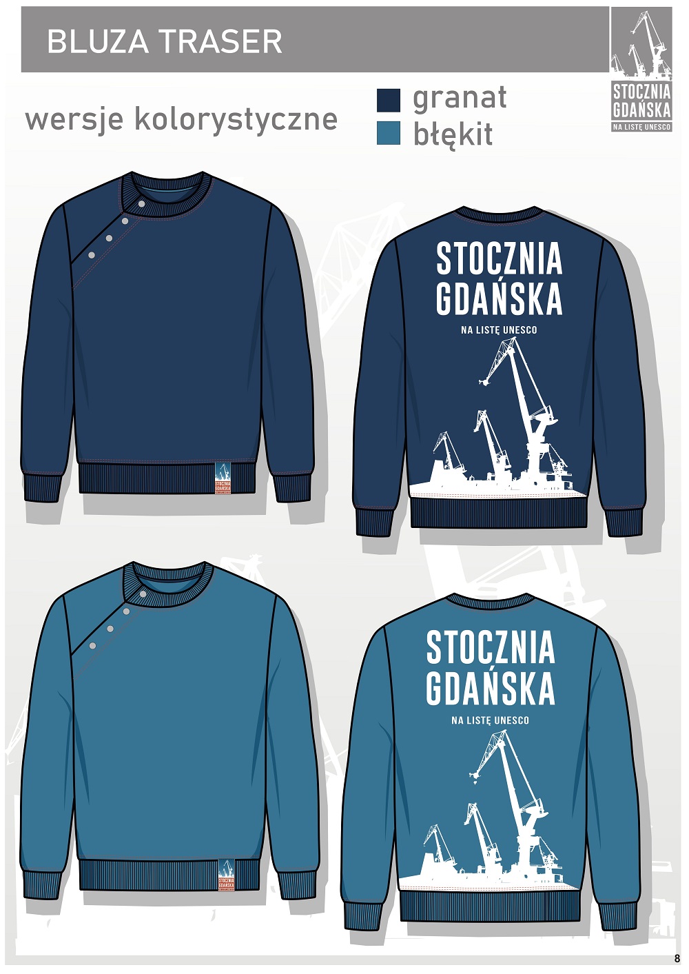 Z kolei bluza nosi nazwę TRASER. Traser to robotnik, którego zadaniem jest kreślenie linii na prefabrykatach wyrobów, wzdłuż których ma być prowadzona ich obróbka, cięcie i wiercenie otworów na nity oraz ich nitowanie. W 1948 roku w Gdańsku zwodowano pierwszy w Polsce statek pełnomorski nazwany właśnie od nazwiska przodownika pracy ze Stoczni Gdańskiej, którym było traser Stanisław Sołdek. Bluza nawiązuje formą do ubioru robotniczego: jest prosta, funkcjonalna i minimalistyczna. Metalowe nity na plisie biegnącej od ściągacza kołnierzyka są inspirowane nitami używanymi w produkcji statków, a nadruk na plecach wykonany metodą sitodruku przedstawia słynne stoczniowe żurawie oraz napis podobny do tego, jaki można zobaczyć na uniformach stoczniowców. Zwycięskie prace wejdą do produkcji, dlatego będzie można je podziwiać na polskich ulicach.