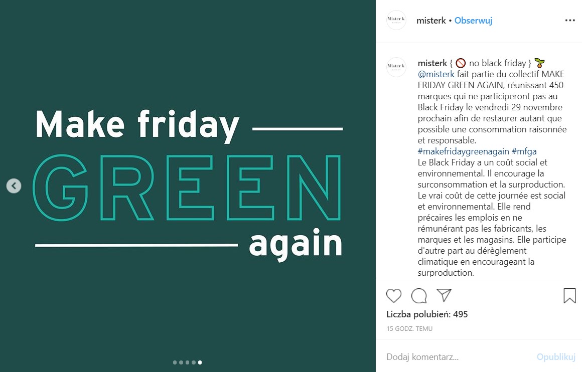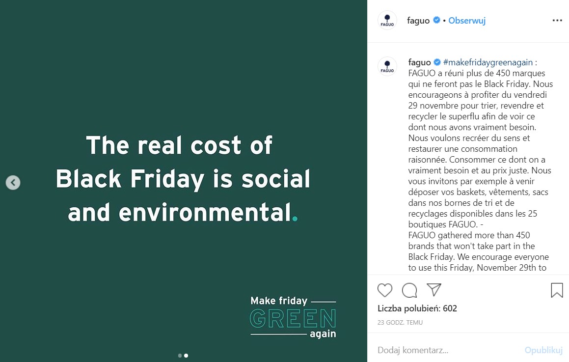 Pomysłodawcą inicjatywy „Make Friday Green Again” jest założyciel francuskiej marki FAGUO, która stawia na zrównoważoną modę. Akcję ostatecznie wsparło ponad 450 brandów, które ogłosiły, że w tym roku rezygnują z organizowania wyprzedażowego szaleństwa, jakim jest Czarny Piątek.