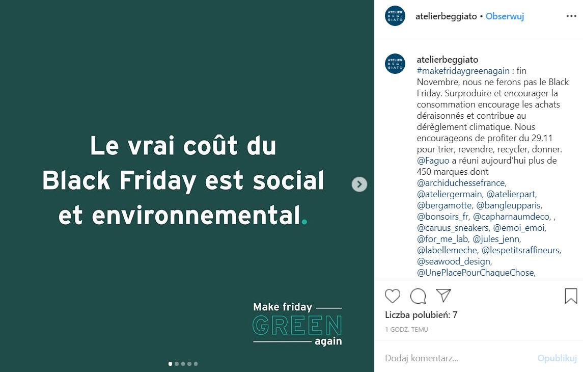 Jeśli zaś chodzi o polski rynek, to butik Slow Concept Store, znajdujący się w warszawskiej Promenadzie, podjął podobną decyzję o rezygnacji z Czarnego Piątku.