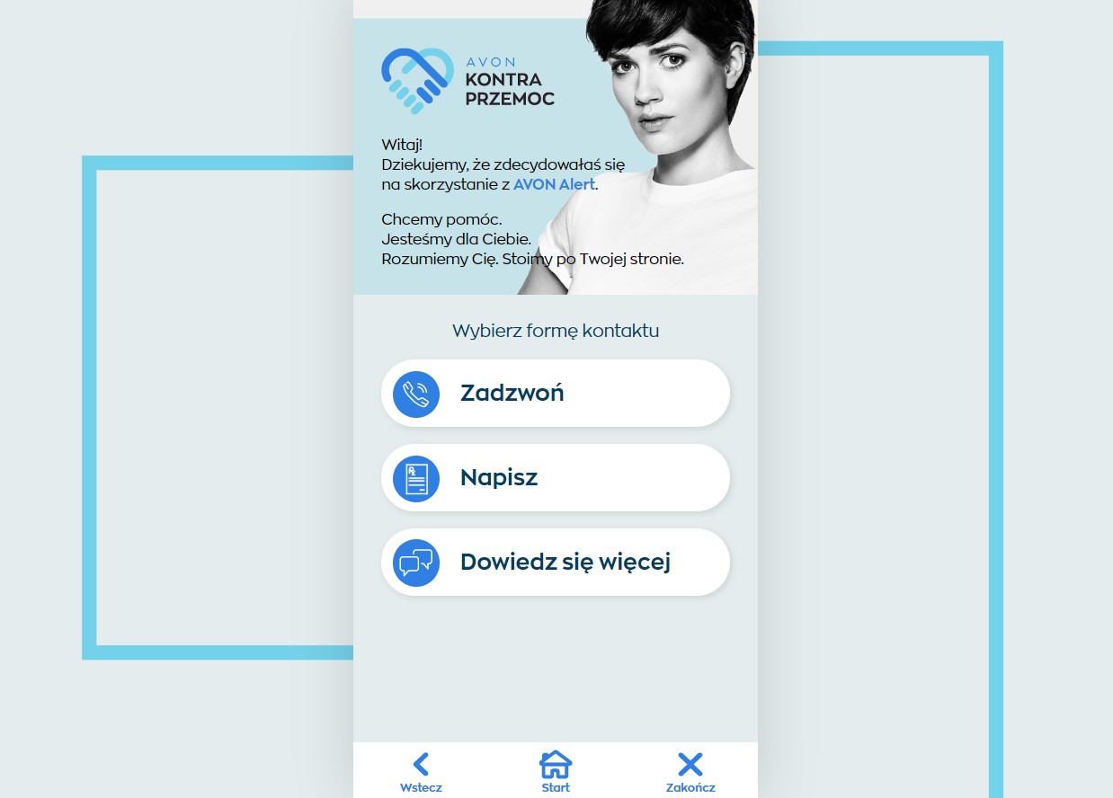 Aby ułatwić pokrzywdzonym wzywanie pomocy w trudnych sytuacjach, organizatorzy kampanii stworzyli pierwszą w Polsce przeciwprzemocową aplikację. Avon Alert umożliwia szybki kontakt z telefonem wsparcia Feminoteki, który zapewnia bezpłatną, profesjonalną pomoc ofiarom i świadkom wszelkich rodzajów przemocy. Aplikacja daje również możliwość dyskretnego wezwania pomocy w formie tekstowej. W aplikacji znajduje się także moduł edukacyjny, dzięki któremu można dowiedzieć się, co jest przemocą i jak sobie z nią radzić, oraz specjalny chatbot, do którego można zwrócić się o pomoc 24 godziny na dobę.
