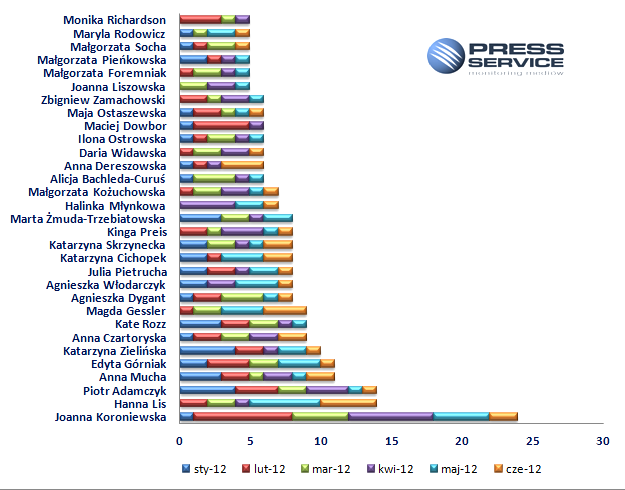 W okresie od kwietnia do czerwca 2012 roku aktorka znalazła się na 12 jedynkach prasy dla pań. Wyprzedziła Hannę Lis (10 okładek) oraz Halinkę Młynkową (7). Z okładek zniknął za to prawie zupełnie Maciej Dowbor, który od stycznia do marca br. gościł na pięciu pierwszych stronach, a w II kwartale pojawił się tylko raz, w kwietniu.
