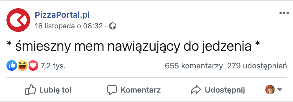 Doceniam również „złote strzały”, które w pewnym momencie zdecydowanie wybijają markę w SM albo same tworzą „trendy” czy wirusowy efekt jak chociażby wpis Pizza Portal.