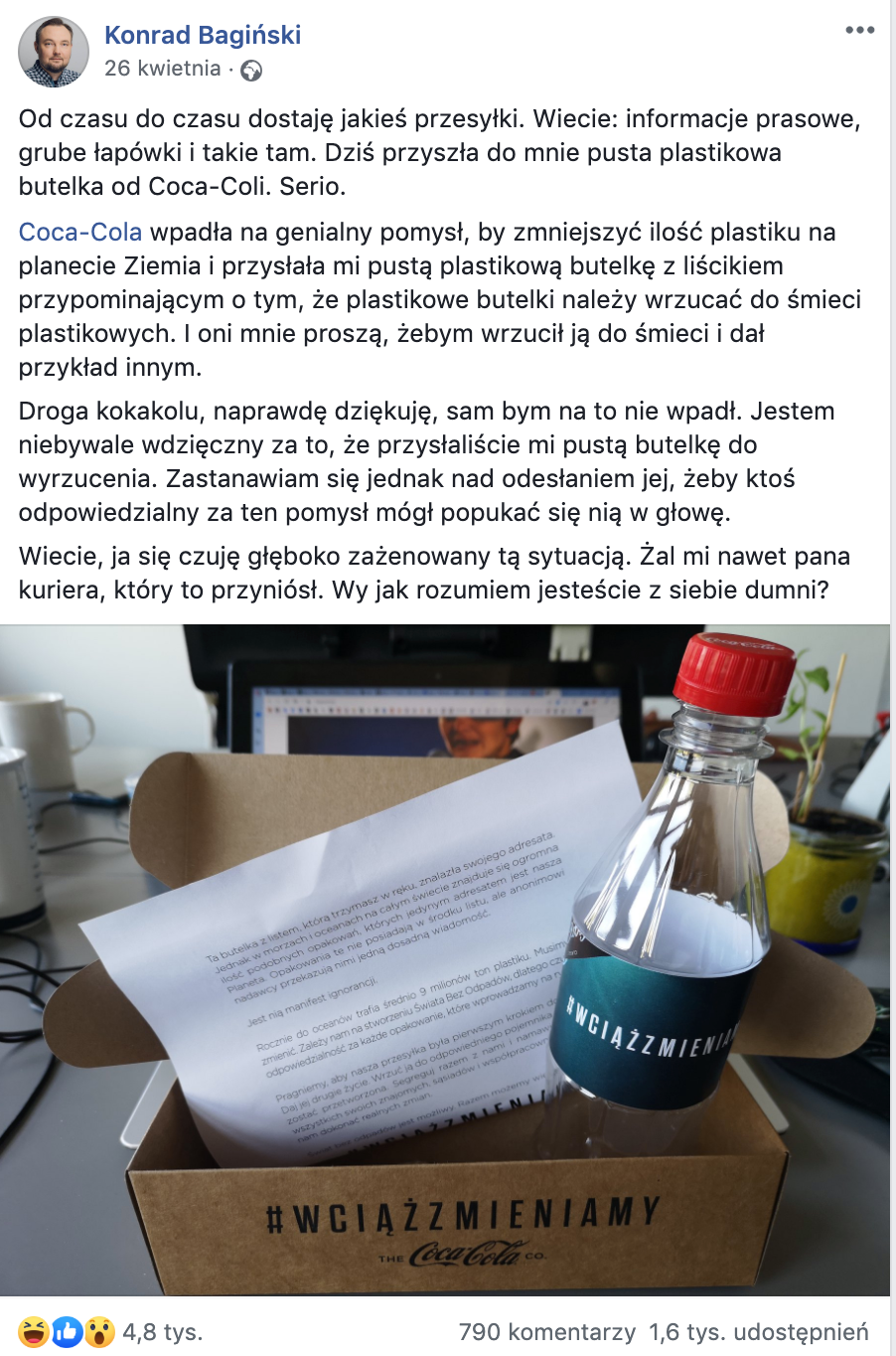 - Ciekawe case study… porażki, czyli Coca Cola wysyłająca do influencerów plastikowe butelki poniosła się w social mediach wręcz wirusowo. A uczyć warto się nie tylko na spektakularnych kampaniach, ale i takich zupełnie nietrafionych.