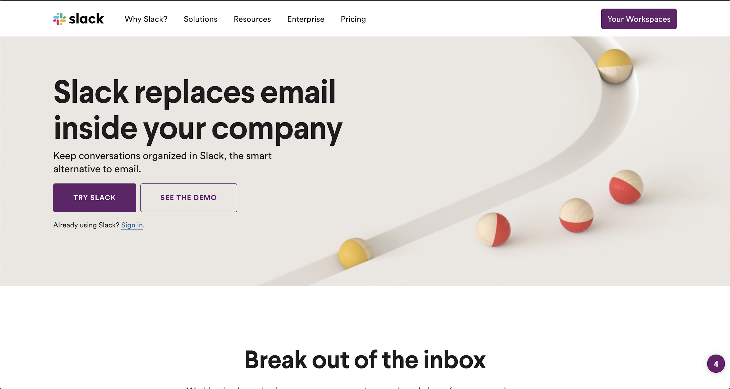 Warto sprawdzić strony najlepszych marek startupowych, które ze względu na bezpośrednią sprzedaż/konwersję, mają realną potrzebę ich ciągłego polepszania. Widoczny jest tu jasny podział na kategorie, persony do których strona mówi, spójny język, czy prostą i skuteczną nawigację. Przykład to nieustannie zmieniająca się strona Slacka.