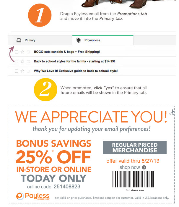 Rys. 5 Newsletter marki Payless oferujący kupon zniżkowy w wysokości 25% w zamian za przeniesienie emaili handlowych marki z foldera “Oferty” do folderu “Główne”