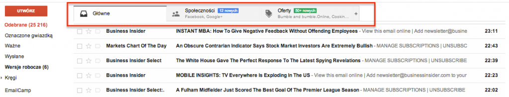W ostatnim tygodniu maja 2013 r. Google uaktualnił usługę pocztową Gmail wprowadzając trzy foldery klasyfikujące e-maile, które otrzymujemy na “Oferty”, “Społeczności” oraz “Główne”. Nie wywołało to uśmiechu na twarzy żadnego e-mail marketera, ponieważ komunikacja masowa od tej pory przenoszona jest do folderu “Oferty”.