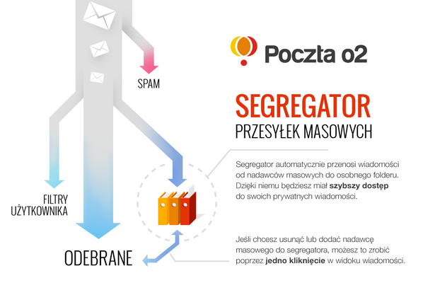 Autorska usługa Poczty o2 nosi nazwę Segregatora i podobnie jak rozwiązanie Google automatycznie filtruje wiadomości od masowych nadawców do specjalnego folderu, odseparowanego od głównego katalogu emaili. Nie jest to też oczywiście folder spam ale odrębny folder na korespondencję handlową, newslettery, biuletyny, etc.