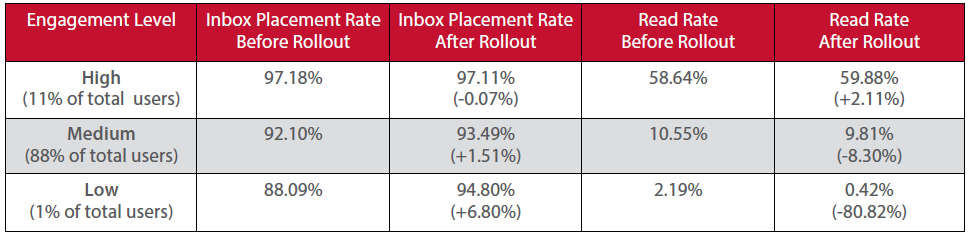 Własne badanie opublikowała również ceniona agencja Return Path, badając procent użytkowników czytających newslettery po wprowadzeniu zakładek, biorąc pod uwagę ich zaangażowanie w komunikację (aktywność). Badanie pokazało, że segregacja emaili wpłynęła pozytywnie na wskaźnik odczytania emaili dla najbardziej aktywnych subskrybentów, natomiast negatywnie na tych, którzy wcześniej nie zapoznawali się aktywnie z przesyłanymi treściami.