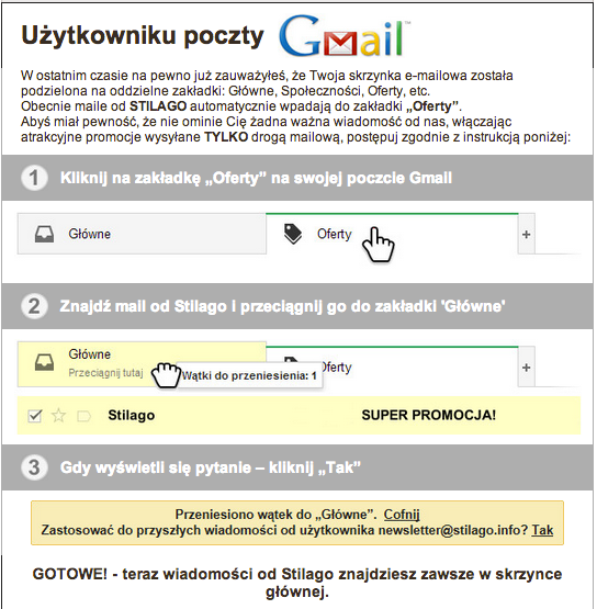 - Zawsze można poprosić odbiorców, aby przenieśli danego maila z zakładki „oferty” do głównego folderu – wtedy Gmail będzie robił to automatycznie.