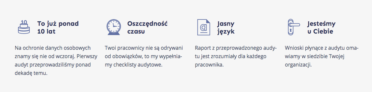Spójrzmy na fragment strony firmy z branży prawnej, specjalizującej się w RODO. Było tam sporo mikrotekstów. Przykład: w opisie oferty należało wymyślić nagłówki do zaprojektowanych piktogramów. Postawiono m.in. na: „Oszczędność czasu”, „Jasny język”, „Jesteśmy u Ciebie”… Nawet w tak krótkich formach można komunikować już konkretne korzyści dla klienta, który wymaga szybkiej usługi, dokumentów napisanych zrozumiałym językiem i wolałby, aby to prawnicy przyjechali do niego, a nie odwrotnie.