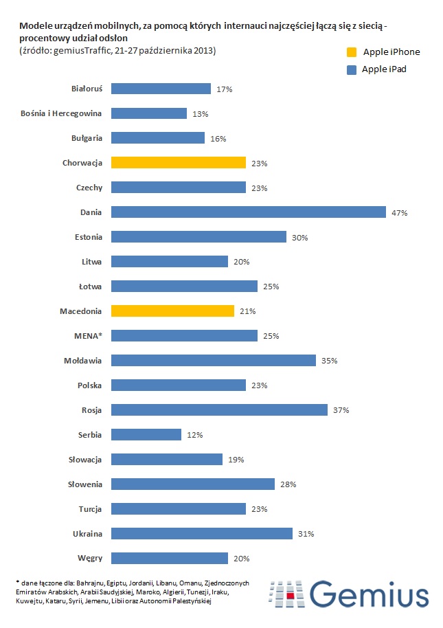 Gemius sprawdził, z jakich modeli urządzeń mobilnych korzystają internauci z krajów, w których firma prowadzi pomiar ruchu na stronach www. Przeanalizowano okres od 21 do 27 października bieżącego roku. Okazuje się, że najczęściej łączą się z siecią przy pomocy iPada. Ten flagowy tablet firmy Apple jest najpopularniejszy w Danii, pochodzi z niego blisko połowa (47 proc.) ruchu w duńskim Internecie. Wyjątkiem jest Chorwacja oraz Macedonia, gdzie odpowiednio 23 proc. i 21 proc. ruchu z urządzeń mobilnych pochodzi z iPhone’a.