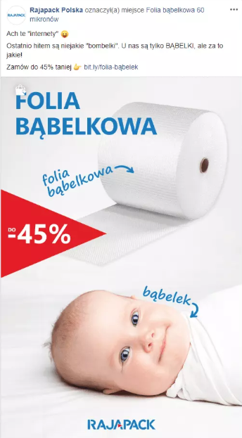 Widzisz post, w którym sklep informuje o promocji na folię bąbelkową. Widzisz drugi post, w którym ten sam sklep promuje ten sam produkt, ale przez nawiązanie do modnych ostatnio „bombelków” (pieszczotliwe określenie małych dzieci). Który post jest bardziej kreatywny? A teraz zgadnij, który z nich miał ponad 2-krotnie większy zasięg organiczny, wygenerował ponad 4-krotnie więcej aktywności i został opublikowany na grupie AIE+ jako przykład kreatywnego postu.