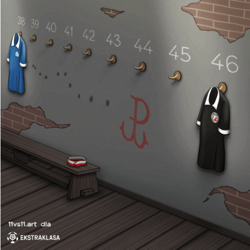 W ten sposób powstał m.in. obrazek dla Ekstraklasy, przez wielu uważany za najlepszy spośród ponad 50, które razem zrobiliśmy. Chcieliśmy stworzyć coś ze smakiem, co przypomni ludziom o przerwie w rozgrywkach o tytuł Mistrza Polski w latach 1939–1945. Początkowo miałem pomysł na rysunek przedstawiający niesamowitą historię Henryka Jaźnickiego. Długo zastanawiałem się, jak ją pokazać. Obrazek miał być przepełniony metaforami, składać się z trzech okienek i pokazywać bohatera przed wojną, w trakcie i po jej zakończeniu. Wspólnie z Ekstraklasą doszliśmy jednak na wniosku, że pomysł ten jest przekombinowany, a większość metafor może być trudna do odczytania. Dlatego musiałem przejrzeć inną szufladę w głowie, tym razem podpisaną „pustka”. Z pustką skojarzyły mi się m.in. wieszaki/haczyki bez ubrań. Między nimi stworzyło się bardzo naturalne połączenie z piłkarskimi koszulkami i szatnią. To jest ta ucieczka w drugą stronę.