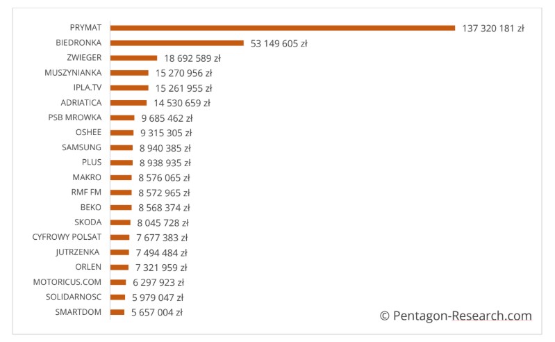 Warto dodać, że prawie połowa wartości mediowej została wygenerowana przez 15 czołowych marek. Jednocześnie odpowiadają one za 1/3 wszystkich wskazań w monitorowanych kanałach telewizyjnych.