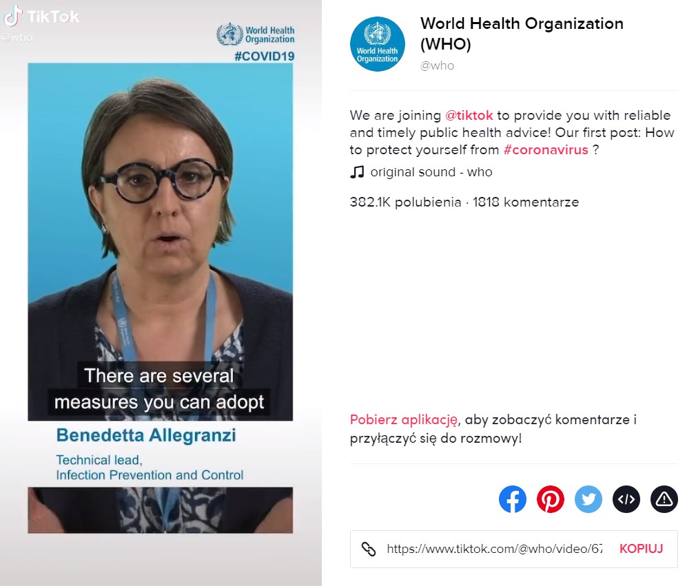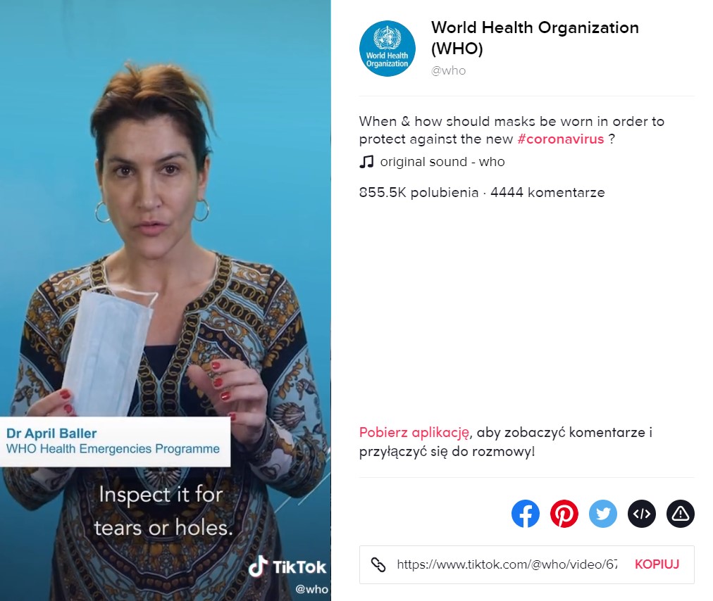 WHO założyło bowiem swój własny profil w tym serwisie, aby edukować internautów na temat koronawirusa. Do tej pory organizacja opublikowała dwa filmiki – w tym pierwszym ekspertka opowiada, jak chronić się przed zarażeniem wirusem, natomiast w drugim wideo poruszony został temat masek ochronnych – kiedy i jak powinno się je zakładać na twarz.