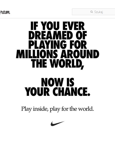 Każdy początkujący sportowiec marzy o tym, by zagrać dla szerokiej publiczności. Teraz każdy z nas może zagrać dla świata, zauważa Nike. W kampanii wzięli udział znani sportowcy jak Michael Jordan, Tiger Woods czy Cristiano Ronaldo.