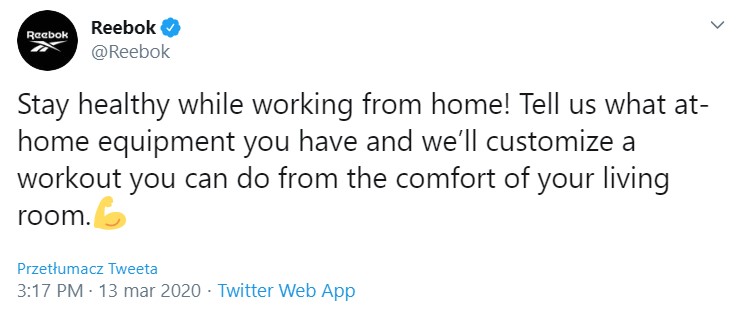 Reebok zachęca za to na Twitterze: wymień sprzęt sportowy, jaki masz w domu, a my stworzymy trening z jego użyciem specjalnie dla Ciebie.