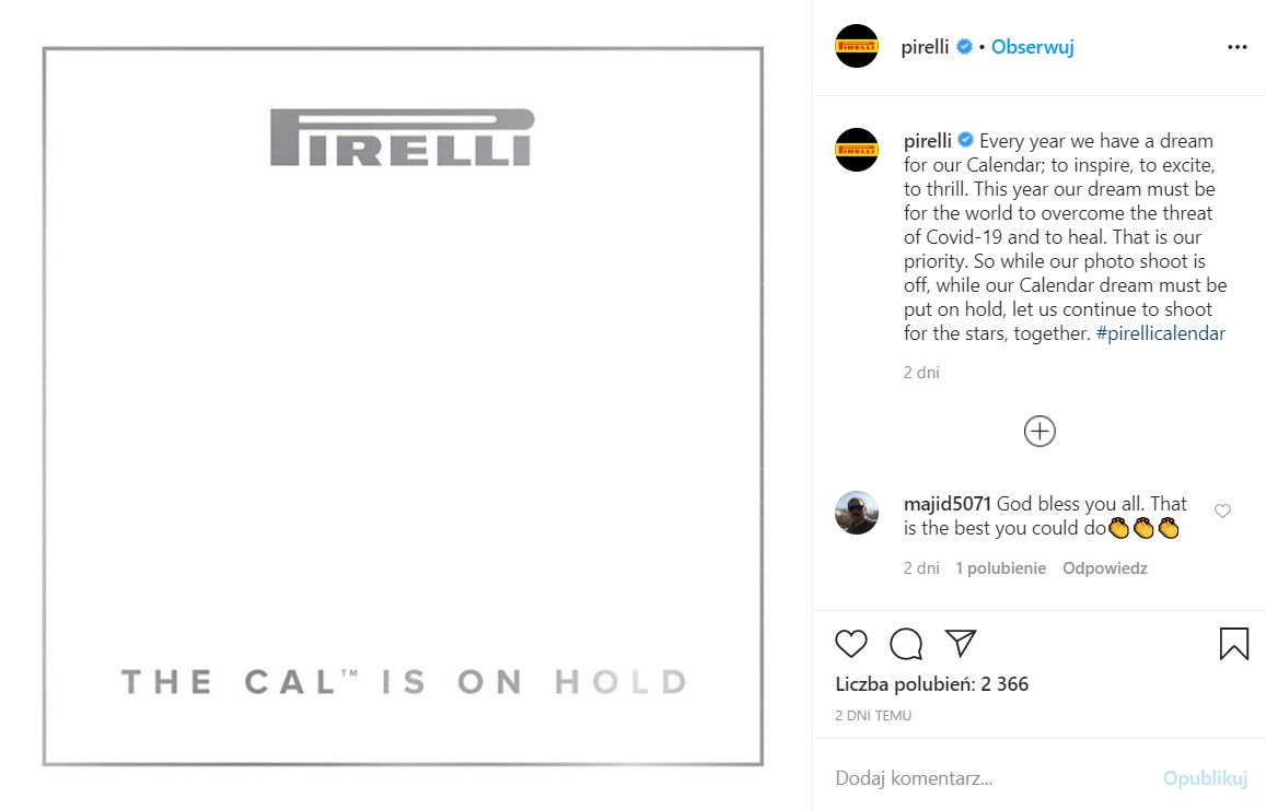 Nie oznacza to jednak, że kalendarz Pirelii już nigdy więcej nie powstanie – jak poinformowali przedstawiciele firmy, prace nad kolejną edycją zostaną wznowione, gdy sytuacja z koronawirusem zostanie opanowana.