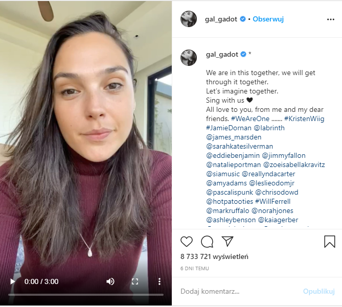 Podczas gdy COVID-19 obiegł już w zasadzie cały świat, tak samo dotarł do tych najbardziej znanych i lubianych. Co robią celebryci w czasach kwarantanny? Oczywiście oni także praktykują social distancing, ale wykorzystują swój status i gigantyczne zasięgi do wysyłania wiadomości ku pokrzepieniu serc do fanów. Kilka dni temu mogliśmy zobaczyć na Instagramie aktorki Gal Gadot niecodzienny montaż – jak przystało na prawdziwą Wonder Woman, zgromadziła wokół siebie cały wachlarz gwiazd wielkiego formatu, by wspólnie odśpiewać „Imagine” zespołu The Beatles.