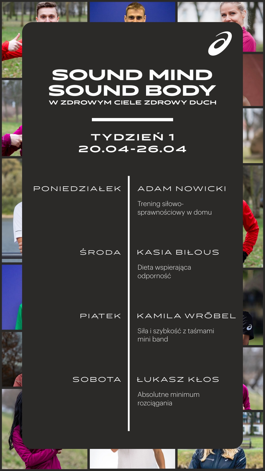 SOUND MIND SOUND BODY to akcja, w ramach której każda osoba, niezależnie od poziomu zaawansowania, będzie mogła przygotować swoje ciało do regularnego biegania, podtrzymać wypracowaną formę czy popracować nad tymi elementami, które pozwolą pobić nowe rekordy życiowe podczas jesiennych startów. Dzięki zaangażowaniu ekspertów z różnych dziedzin – trenerów, fizjoterapeutów, dietetyków sportowych, członków drużyny ASICS FrontRunner Poland i najlepszych polskich biegaczy długodystansowych, takich jak Aleksandra i Błażej Brzezińscy, Arkadiusz Gardzielewski, Aleksandra Lisowska czy Szymon Kulka – ASICS zapewnia holistyczne podejście do treningu. Zadbają oni o to, by zaproponowane ćwiczenia i porady były adekwatne do potrzeb i warunków codziennego funkcjonowania w czterech ścianach, łącząc bezpieczeństwo, efektywność i kreatywne wykorzystanie rzeczy dostępnych w każdym miejscu zamieszkania, zarażając przy tym uśmiechem i pozytywną energią.