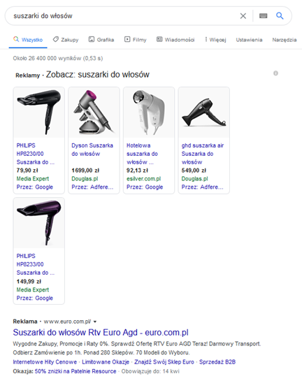 Wyniki Google pod frazę suszarki do włosów: