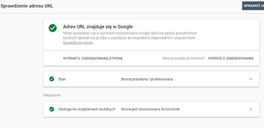 Jeśli nie znajdziemy w ten sposób naszej treści w wynikach Google, może to oznaczać, że nie jest ona poprawnie zaindeksowana. Do bardziej szczegółowych analiz możemy wykorzystać Google Search Console i raport o indeksacji danej podstrony (tam również możemy prosić o zaindeksowanie nowej podstrony).