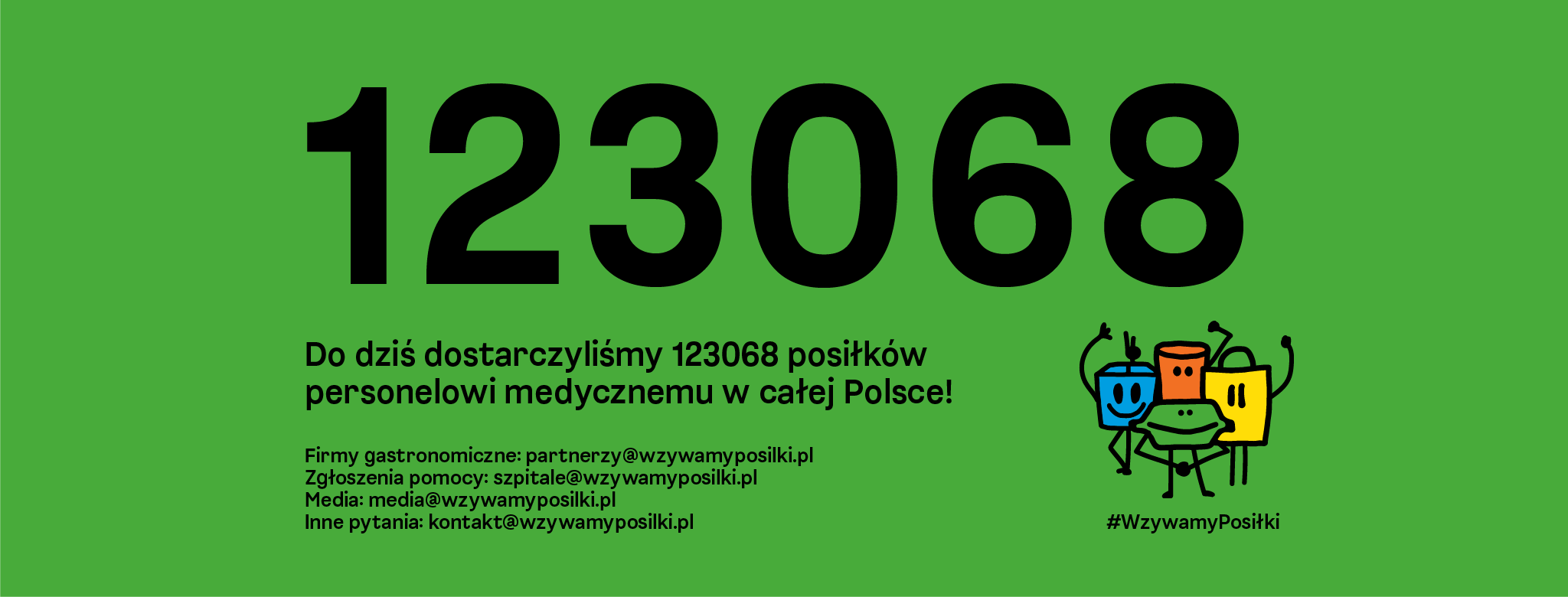 Ogólnopolska akcja #WzywamyPosiłki angażuje z kolei popularne sieci restauracji oraz kawiarni, firmy cateringowe, producentów napojów i żywności, a także lokalne restauracje w pomoc pracownikom placówek medycznych, stacji pogotowia oraz punktów laboratoryjnych. Dzięki weryfikacji realnego stanu zapotrzebowania na produkty spożywcze w tych miejscach, od początku inicjatywy udało im się dostarczyć ponad 123 000 posiłków (stan na 21.04.2020 r.).
