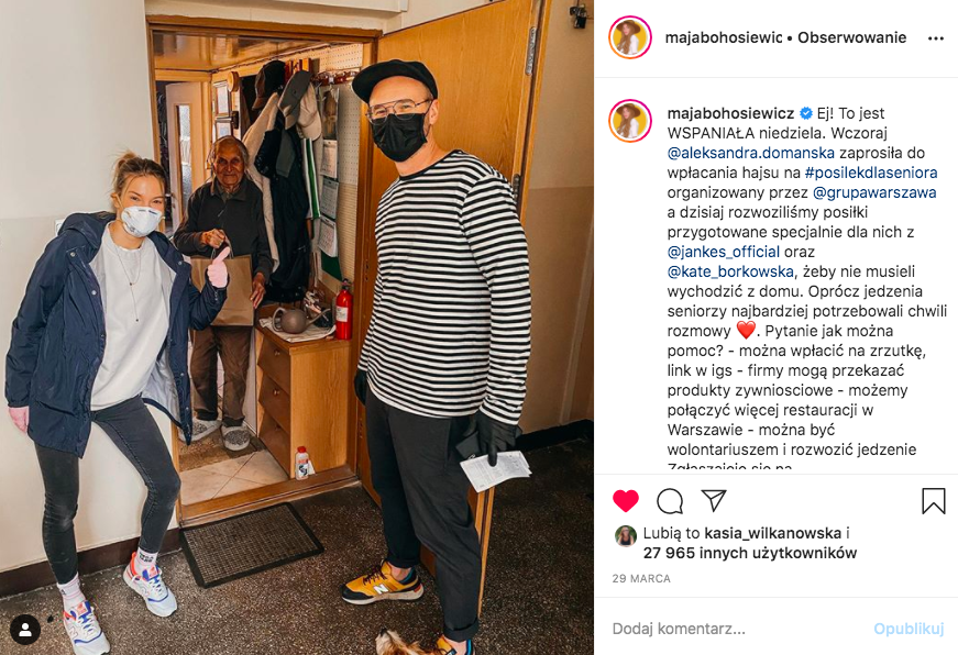 Grupa Warszawa z troski o osoby starsze, które stanową ponad 22% ludności Warszawy, zainicjowała akcję #PosiłekDlaSeniora. Celem jest zapewnienie zbilansowanego, wartościowego posiłku osobom powyżej 60 roku życia na terenie stolicy. Darczyńcy nie tylko pomagają seniorom w tym trudnym czasie, ale też wspierają pracowników gastronomii. W akcję włączyli się też znani celebryci i influencerzy m.in. Maja Bohosiewicz, Aleksandra Domańska, Jankes wraz z Katarzyną Borkowską czy Anna Skura. Wykorzystując swoje zasięgi w mediach społecznościowych, nagłaśniają inicjatywę. Osobiście też rozwożą posiłki seniorom.