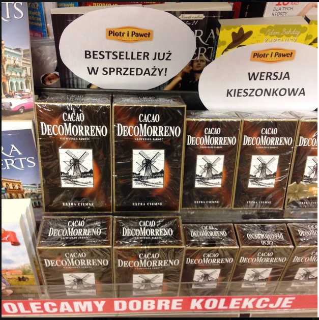 W asortymencie sklepu można było kupić wspomniane kakao. Osoby robiące zakupy mogły zaopatrzyć się w popularną „książkę”. Na zdjęciu widać, że produkt spożywczy został umieszczony pośród propozycji książkowych, co było bardzo ciekawym pomysłem. Kreatywne było także zaproponowanie wersji kieszonkowej, czyli produktu o mniejszej pojemności.