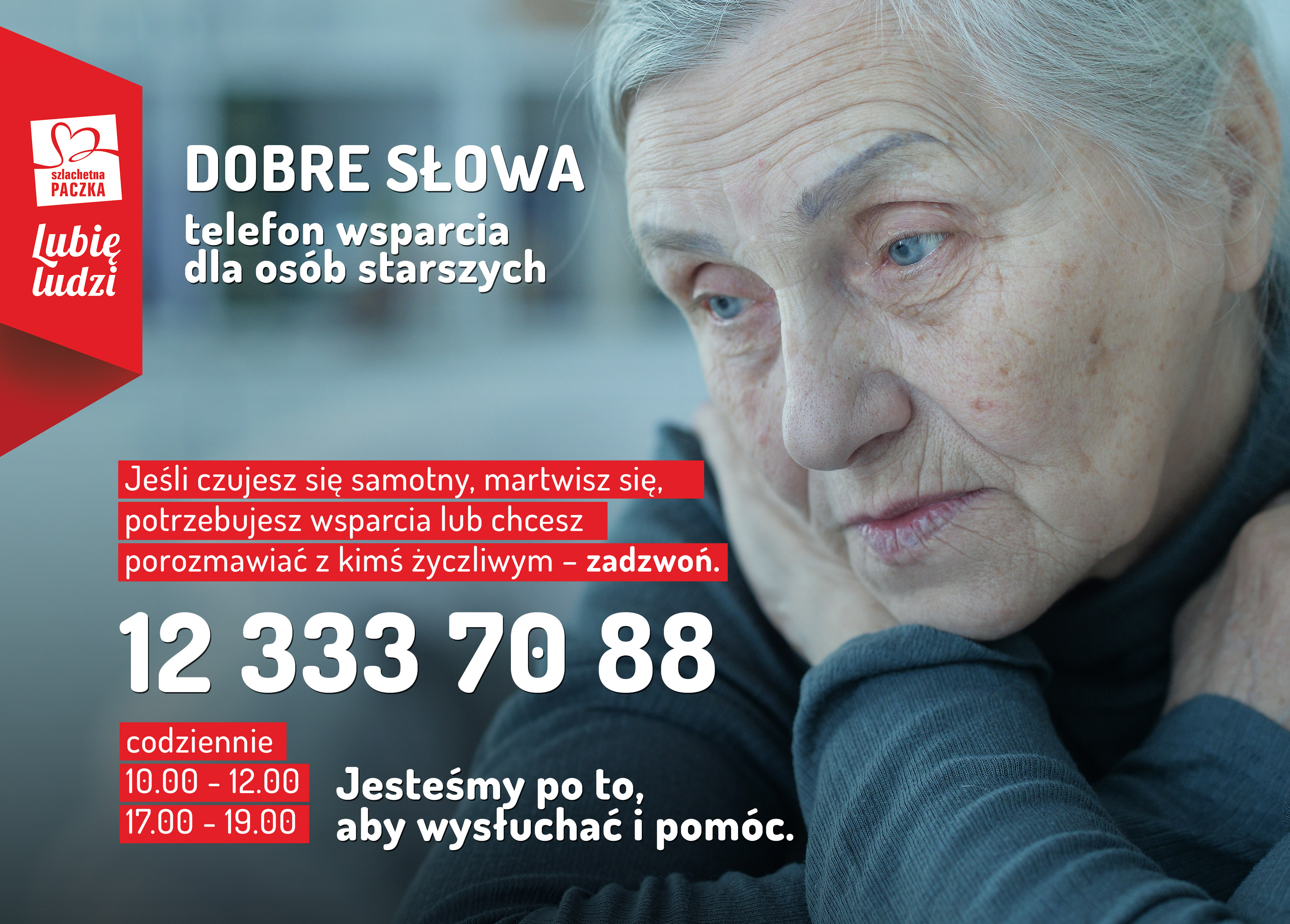 Z kolei w walce z dojmującą samotnością Szlachetna Paczka uruchomiła specjalny telefon wsparcia dla seniorów „Dobre słowa”. Dzwonić można codziennie w godzinach 10:00-12:00 oraz 17:00-19:00 pod numer 12 333 70 88. To ważne, żeby o telefonie dowiedziały się osoby starsze. „Dobre słowa” mają zagościć tam, gdzie są seniorzy – w szpitalach, w domach opieki, na klatkach schodowych czy w sklepach, dlatego zachęcamy, aby opowiedzieć o infolinii znajomym, poinformować sąsiadów. Niech starsi i samotni wiedzą, że ktoś na nich czeka.