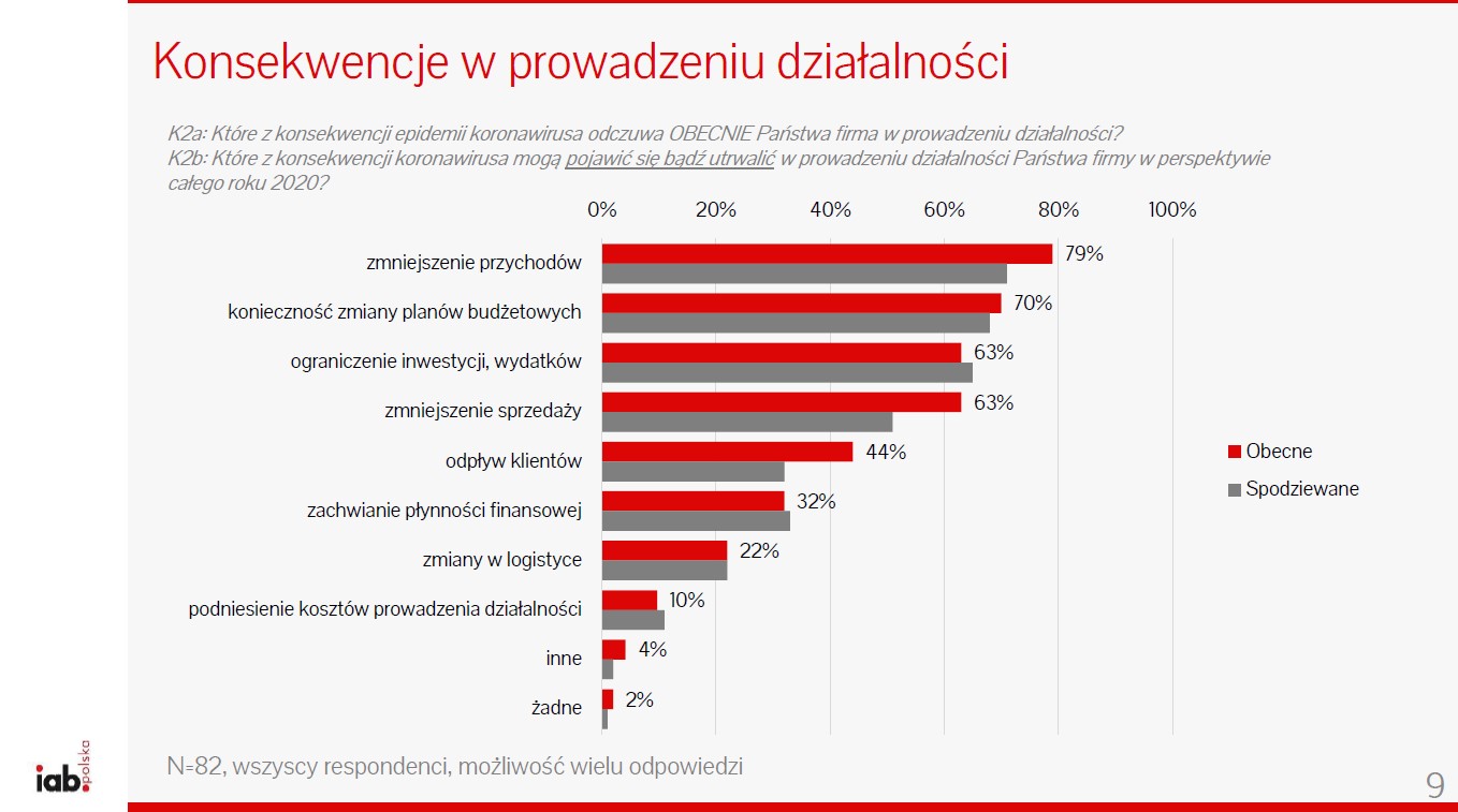 91% wydawców odczuło spadek przychodów reklamowych – największe w przypadku reklamy graficznej (zarówno statycznej, jak i wideo), a także powierzchni sprzedawanej w modelu programmatic oraz na platformach desktop. Jeśli chodzi o podział branżowy, największe spadki odnotowano u dwóch dotychczasowych liderów tortu reklamowego online (branża motoryzacyjna oraz finansowa) oraz w sektorach, które zostały bezpośrednio dotknięte przez lockdown (czas wolny oraz podróże, turystyka, HoReCa ). Największe wzrosty zanotowano z kolei w branżach: farmaceutyki, handel oraz żywność.