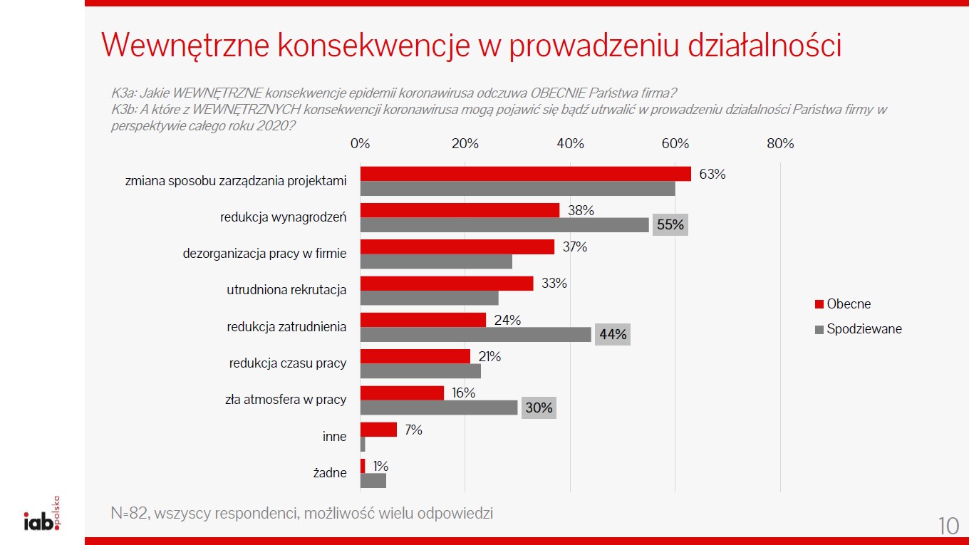 Wśród bieżących wewnętrznych konsekwencji w prowadzeniu działalności badani wskazywali zmianę sposobu zarządzania projektami – 63%, redukcję wynagrodzeń – 38%, dezorganizację pracy w firmie – 37%. Wśród długoterminowych konsekwencji – oprócz utrwalenia zmian w organizacji sposobów zarządzania projektami – spodziewana jest dalsza konieczności redukcji wynagrodzeń i zatrudnienia (odpowiednio 55% i 44%) oraz zła atmosfera w pracy (30%).