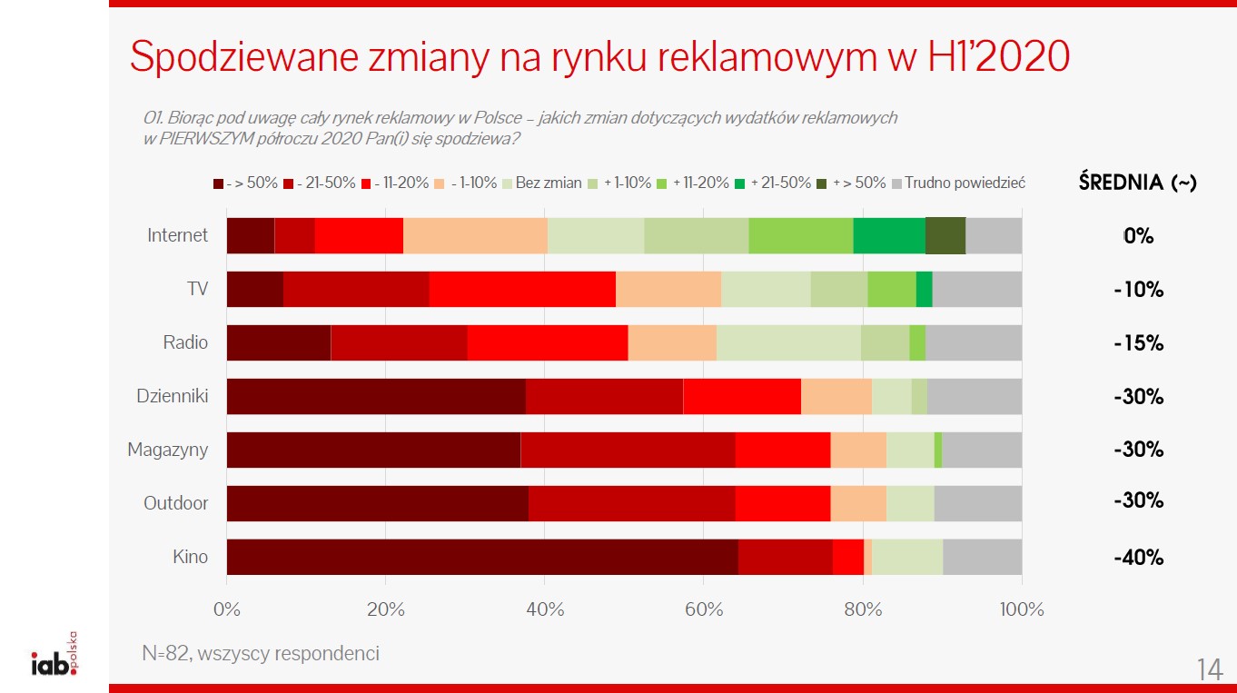 Internet jest jedynym medium, które według badanych nie zaliczy spadków w pierwszym półroczu. Równocześnie, oczekiwania wskazują, że medium to jako całość nie odnotuje wzrostów. W nieco gorszej sytuacji w opinii respondentów jest telewizja (szacowany spadek o 10%) i radio ( 15%). Wydatki na media drukowane oraz reklamę uliczną mogą spaść o około 30%, zaś na kino o 40%.