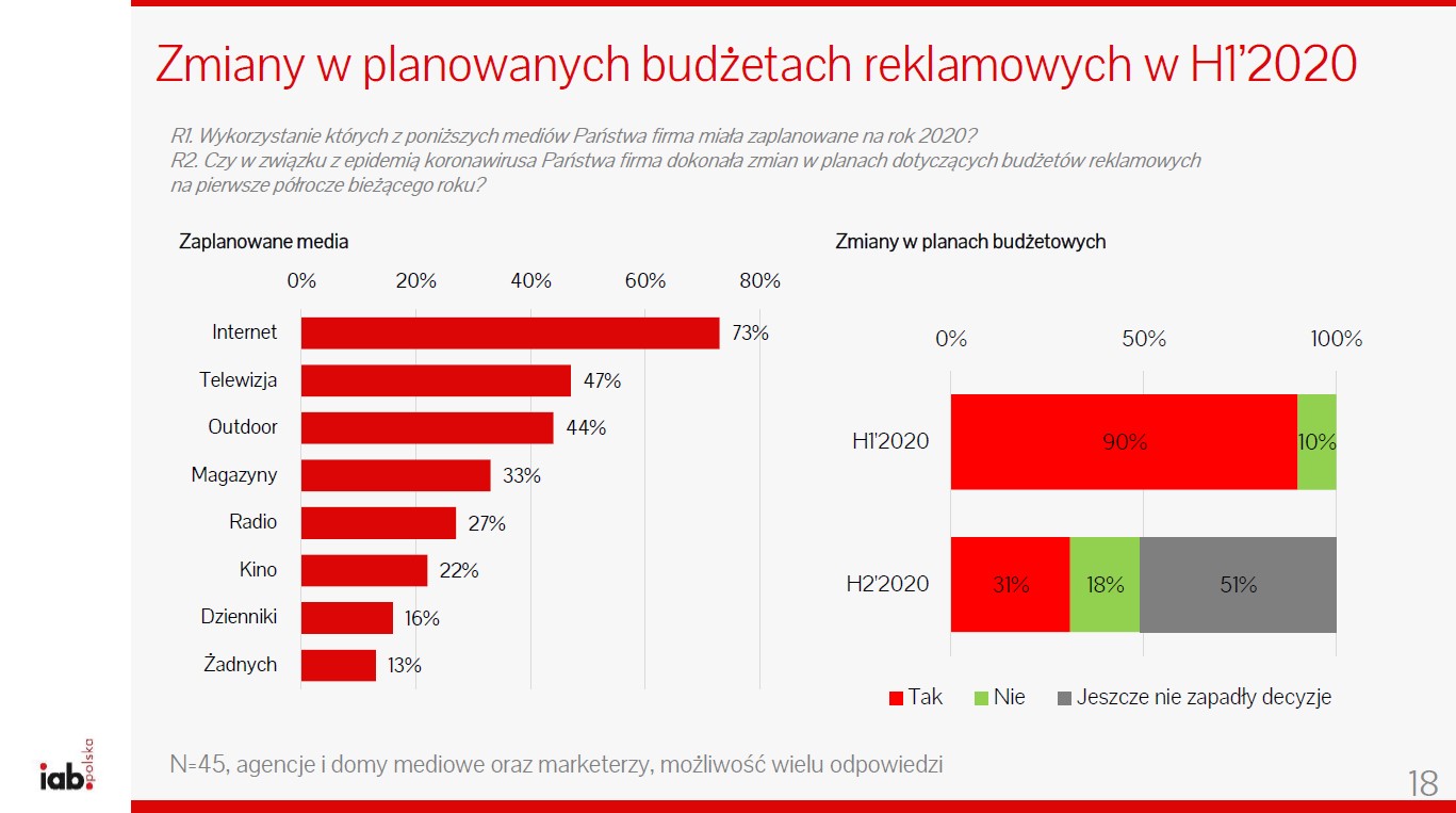 Prawie wszyscy respondenci (90%) pracujący w agencjach i domach mediowych oraz reklamodawcy zmienili plany związane z wydatkami reklamowymi przewidzianymi na pierwsze półrocze 2020 roku. Internet oraz telewizja to jedyne media, w przypadku których zwiększono nakłady – jedna czwarta firm, które zaplanowały działania marketingowe online, zwiększyła je w związku z epidemią. Jeśli chodzi o plany dotyczące wydatków reklamowych w drugim półroczu, połowa firm zarządzających budżetami reklamowymi jeszcze nie podjęła decyzji.