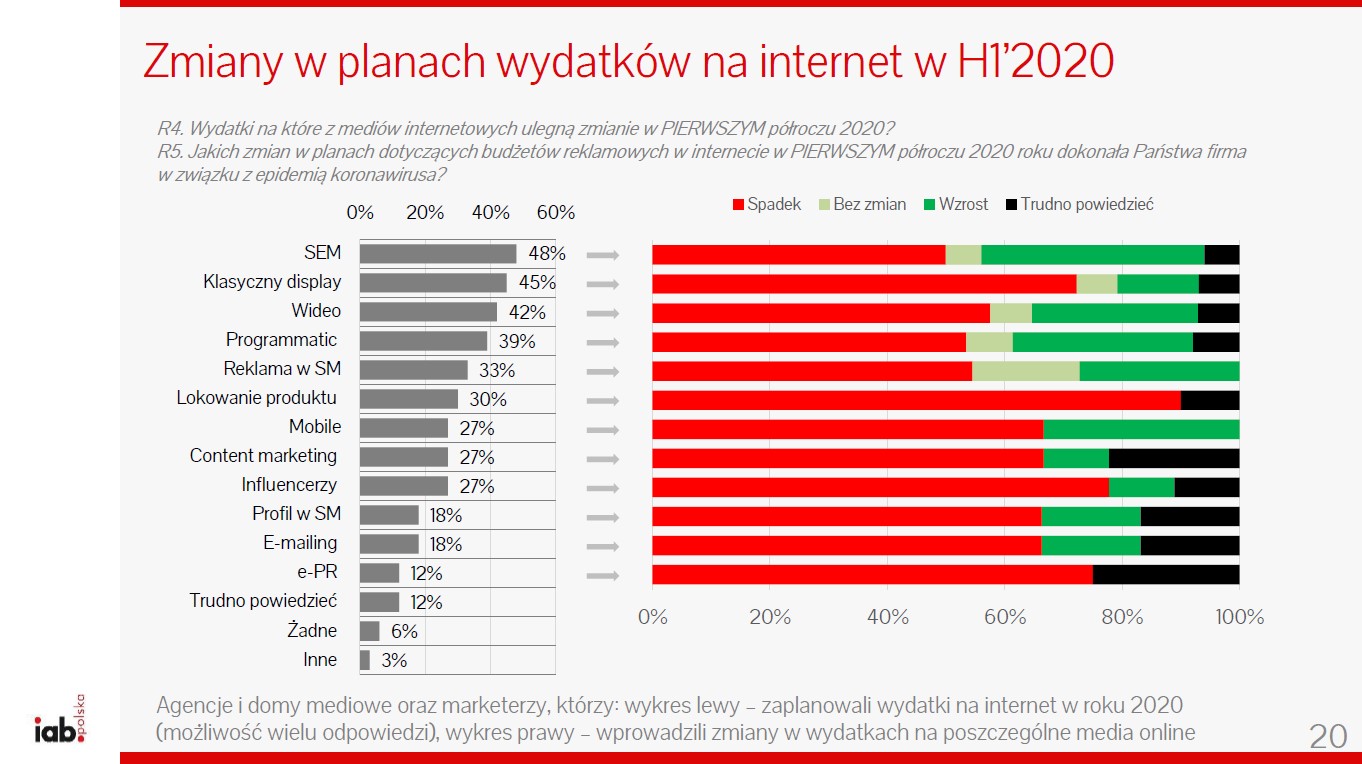 Zmiany w budżetach dotknęły praktycznie wszystkich kanałów komunikacji cyfrowej. Najczęściej rewizję nakładów deklarowano w odniesieniu do liderów tortu reklamowego online: reklamy w wyszukiwarkach i sieciach kontekstowych (SEM 48%) i reklamy graficznej (klasyczny display: 45%, wideo: 42%). Najrzadziej redukowano wydatki na SEM, wideo , programmatic, reklamę w social media. Wyłącznie spadki deklarowano w przypadku lokowania produktu oraz działań z zakresu e-PR.